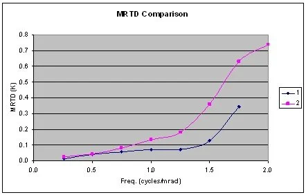 The temperature contrast at which the bars disappear is recorded. The temperature contrast is then inverted, cold bars on a hot background, and the measurements are repeated and averaged together. Figure 3 depicts a typical MRTD curve.