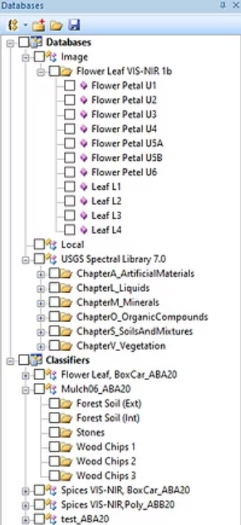 Screenshots of the spectral database features, showing multiple databases in tree and spreadsheet forms, ready for spectral comparisons.